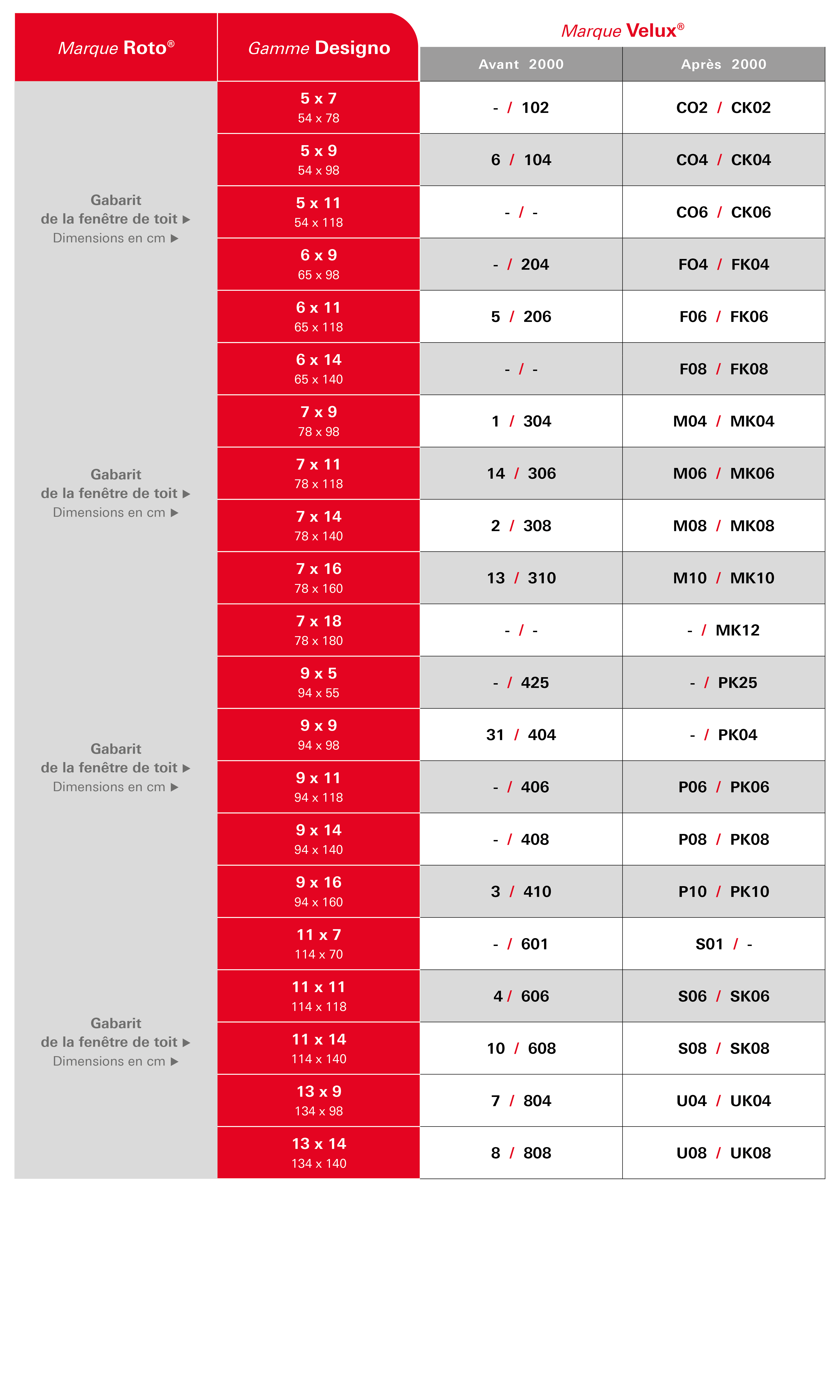 Tableau de correspondance des tailles